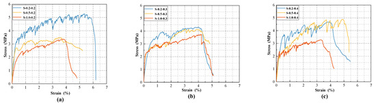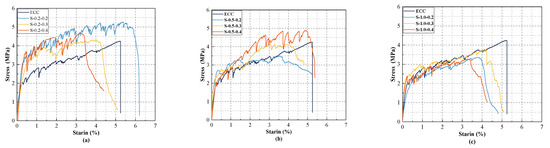 Stress–strain curves of SMA/PVA-ECC with different content of SMA fibers of the same diameter. (a) Specimens with SMA fiber diameter 0.2 mm. (b) Specimens with SMA fiber diameter 0.5 mm. (c) Specimens with SMA fiber diameter 1.0 mm.