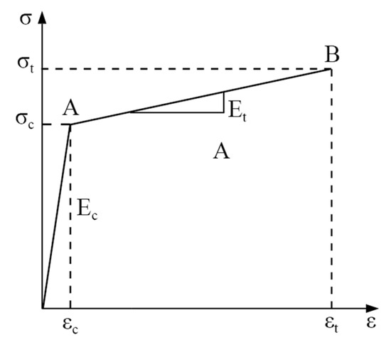 To minimize the influence of initial eccentricity and initial torque on the curve, the concept of fitting crack initiation point (σc, εc) is introduced, which is defined as the intersection point of the fitting line OA in the elastic stage and the fitting line AB in the strain hardening stage. The simplified axial constitutive relationship is expressed as Equations (2) and (3) [22].