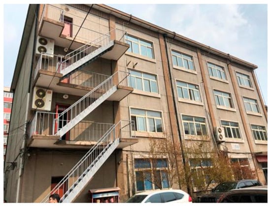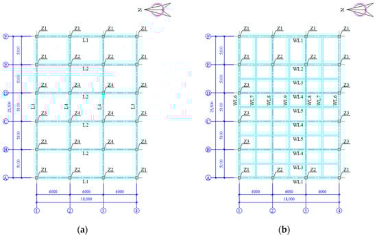 The pilot project of seismic strengthening was a four-storey RC frame structure (namely frame KJ1), as shown in Figure 1. The total area of the frame KJ1 was approximately 1900 m2. The length was 25.5 m in the east–west direction, and the width was 18.0 m in the north–south direction. The total height of the frame KJ1 was 14.8 m, and the storey heights from the ground floor to the top floor were 4.11 m, 3.30 m, 3.30 m and 4.09 m, respectively. The RC frame structure was located in a seismic precautionary intensity of 8 degrees. The site class was Class II. The design earthquake group was Group II. Additionally, the characteristic period value was 0.4 s.