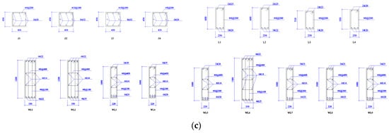 The schematic diagrams and cross-section reinforcement of one-story, one-span frame structures are plotted in Figure 7, and detailed information refers to references [27,28]. K1 and K2 represented two frame structures of different beam spans strengthened with diagonal braces and self-centering precast beams, respectively. The final number 1 indicated the original frame structure, and number 2 indicated the strengthened frame structure. The column height was 2400 mm, and the cross-sectional dimensions of columns for K1-1 and K2-1 were 270 × 270 mm. The beam spans of K1-1 and K2-1 were 3600 mm and 3060 mm, respectively. The beam heights of K1-1 and K2-1 were 360 mm and 306 mm, respectively. Additionally, the beam widths of K1-1 and K2-1 were 150 mm. Compared with K1-1, K1-2 was strengthened by the enlarging cross-section method and setting the diagonal braces, and the cross-sectional dimensions of columns for K1-2 were 390 × 390 mm. Compared with K2-1, K2-2 was strengthened by the enlarging cross-section method and setting the self-centering precast beam. The cross-sectional dimensions of columns for K2-2 were 390 × 480 mm. The beam heights of K1-2 and K2-2 were 480 mm, and the beam widths of K1-2 and K2-2 were 270 mm.