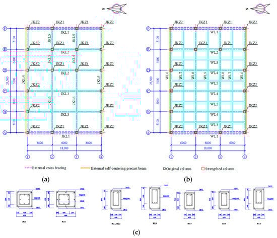 According to the requirements of first party, it was planned to remove the four frame columns from the first to the third storey. The interior of the frame KJ1 was changed to a large space, which resulted in a significant reduction in the lateral stiffness. The bearing capacity and deformation capacity of the frame structure did not meet the code requirements. According to the performance-based seismic design method, the original frame structure was strengthened by the enlarging cross-section method and the external self-centering substructure to improve the seismic resilience, namely frame KJ2. The self-centering precast beams were set up on the north–south exterior facades, and the diagonal braces were set up on the west–east exterior facades. Additionally, the diameter of the diagonal braces was taken as 50 mm. The structural plan layout of frame KJ2 and the cross-sectional dimensions of the beams and columns are plotted in Figure 4.