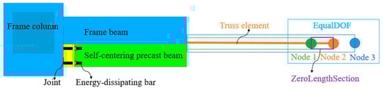 The connection part between the precast beam and the frame structure was a challenging part of the numerical simulation. The precast beams could be rotated in their plane. Additionally, the connection of the precast beam and the frame structure relied on steel strands and energy-dissipating bars. The ZeroLengthSection was set at the connection and given the ENT (Elastic-No Tension) material. Moreover, energy-dissipating bars were placed in the ZeroLengthSection. Considering the deformation compatibility between the precast beam and the frame structure during the loading process, the multi-point constraint (equalDOF) command was used to constrain the degrees of freedom for the nodes. Three nodes were constrained to the same position. Node 3 was the frame joint, and Node 2 was the end of the steel strand. The degrees of freedom for Node 2 and Node 3 were exactly the same. Node 1 was the end of the self-centering precast beam, and could rotate in the plane. The specific modelling method of self-centering precast beams is shown in Figure 6.