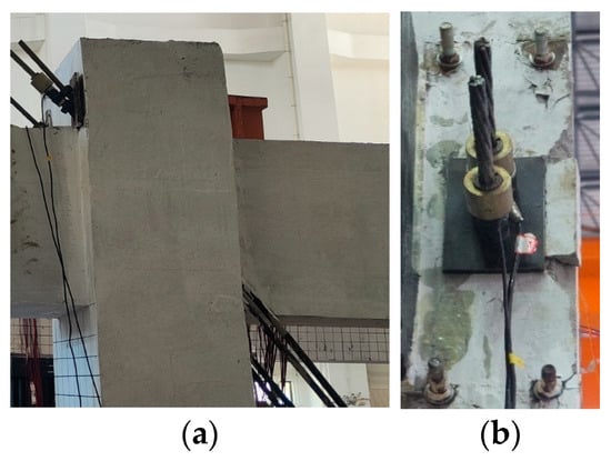 For K1-2, the bottom of steel strands was the fixed end, and the top of steel strands was the tensioned end. Among them, the tensioned end used wedge-type anchorage, and the fixed end used extruding anchorage, as displayed in Figure 8a. For K2-2, both ends of steel strands were simultaneously tensioned before the test, as depicted in Figure 8b. The energy-dissipating bars were tapped and then fixed with nuts.