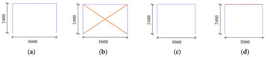 Finite element models of one-story one-span frame structures. (a) K1-1 (b) K1-2 (c) K2-1 (d) K2-2.