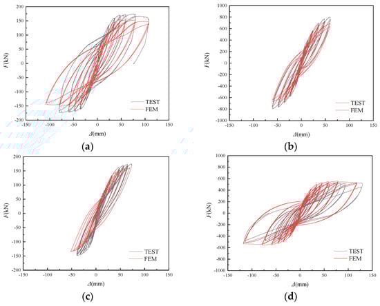 The hysteresis curves of the test and simulation are plotted in Figure 10. It could be seen that the test results were generally in good agreement with the finite element simulation results. All errors were within 20%, confirming the rationality and reliability of the modelling method.