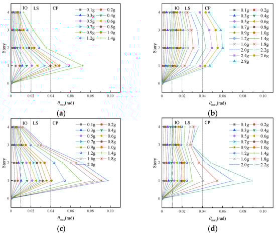 FEMA 356 [30] defines three performance points of the maximum inter-story drift (θmax). Under different performance states, the reference value CΔ of the maximum inter-story drift is exhibited in Table 5.
