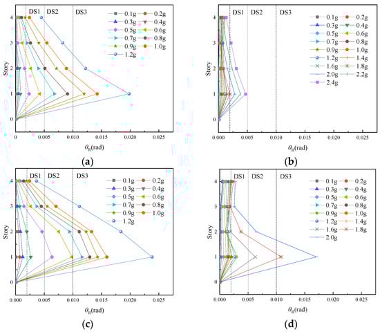 Distribution diagram of residual inter-story drifts. (a) KJ1-x; (b) KJ2-x; (c) KJ1-y; (d) KJ2-y.