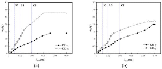 The distribution diagrams of the maximum inter-story drift are obtained by amplitude modulation, as shown in Figure 13. The frame numbers of x and y represent earthquakes in the x and y direction, respectively. The maximum inter-story drift of each storey increased with increasing the peak ground acceleration. The maximum inter-story drift of frame KJ1 decreased as the storeys increased. Additionally, the maximum inter-story drift occurred in the first storey under different peak ground accelerations, which applied to the soft storey of the frame structures. Frame KJ2 adopted the enlarging cross-section method and set cross braces in the x direction; the maximum inter-story drift moved upwards, and the soft storey was transferred to the second or the third storey. However, the soft storey was still the first storey in the y direction. The maximum inter-story drift of frame KJ1 satisfied the IO state at 0.2 g; the LS state at 0.4 g; and the CP state near 0.8 g. The maximum inter-story drift of frame KJ2 satisfied the IO state at 0.4 g; the LS state near 0.8 g; and the CP state near 1.8 g. Besides, compared to frame KJ1, the maximum inter-story drift of frame KJ2 was significantly reduced under the same the peak ground acceleration. Additionally, the effect of the enlarging cross-section method and setting the cross braces was more significant.