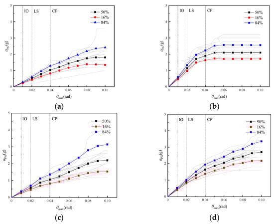 IDA curves and their summary fractile curves are depicted in Figure 16 under the action of twenty earthquake ground motion records. Statistical analysis was conducted according to θmax, and the median and logarithmic standard deviation of θmax were calculated. Thus, fractile curves of 16%, 50%, and 84% were obtained. It could be seen that (1) the shape of IDA curves was different. The curves had characteristics of “excessive softening”, “excessive hardening”, and “fluctuation”. The IDA curve could comprehensively reflect the possible seismic responses of frame structures under different intensity levels. (2) Under the same earthquake direction, the difference between the mean values of θmax was significant for frames KJ1 and KJ2. The IDA curve of frame KJ2 showed overall data points moving to the left, which indicated that the seismic performance of the existing frame structure could be significantly improved by the enlarging cross-section method and the external self-centering substructure.