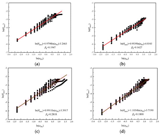 Both sides of the equation take the natural logarithm at the same time. Linear regression was conducted using mathematical software. Additionally, the probabilistic seismic demand model curve of frame structures was obtained (as displayed in Figure 17), as given in Equation (2):