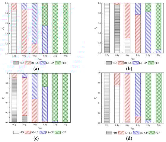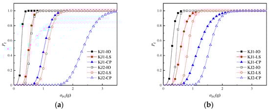 A comparison of failure states is illustrated in Figure 19. As an example of the analysis, the failure state of the frame structures is compared under the action of the earthquake in the x direction. Comparing Figure 19a,b, it can be seen that when aPG is 0.2 g, the exceedance probability of the IO state for frame KJ2 increases from 86.9% to 100.0%. When aPG is 0.4 g, the exceedance probability of the IO state increases from 0.9% to 96.9%. When aPG is 0.6 g, the exceedance probability of the IO state increases from 0.0% to 30.4%; the exceedance probability of the LS state increases from 19.8% to 69.6%; and the exceedance probability of the CP state decreases from 79.9% to 0.0%. When aPG is 1.0 g, the exceedance probability of the LS state increases from 0.0% to 77.4%; the exceedance probability of the CP state decreases from 55.6% to 22.6%; and the exceedance probability of the collapse state decreases from 44.4% to 0.0%. When aPG is 2.0 g, the exceedance probability of the CP state increases from 0.0% to 82.8%, and the exceedance probability of the collapse state decreases from 100.0% to 17.2%. It is evident that the exceedance probability of the frame structures is significantly reduced, and the safety margin is greatly increased.