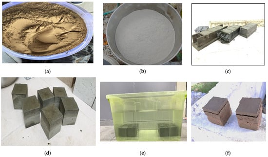 (a) Raw alum sludge (b) Raw fly ash (c) Geopolymer paste in a steel mold. (d) The alum sludge-fly ash geopolymer paste samples were removed from the mold after oven drying for 7 h. (e) Alum sludge-fly ash geopolymer paste sample in the curing tank. (f) Geopolymer mortar sample debonded, cracked, and deteriorated when immersed in the curing tank after 24 h.