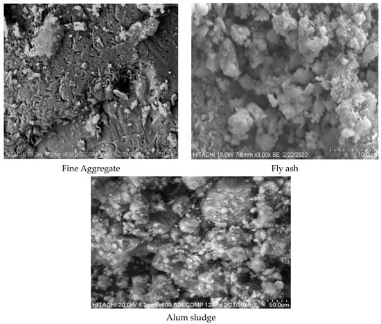 Alum sludge’s chemical composition is shown in Table 2, and it can be seen that alum sludge has higher SiO2 (46.54%) and Al2O3 (38.75%) with other minor elements dictated. The microstructure image from Figure 2 shows that alum sludge is made up of particles that are irregular in shape, with an obvious rough surface morphology, pervious structure, and amorphous in nature [,,]. In contrast, river sand had SiO2 as the highest element concentration of about 80.76% and Al2O3 up to 11.64%, with an angular particle shape and specific gravity of 2.63.