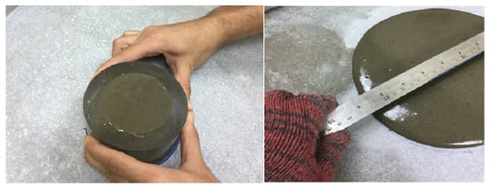 The fresh state of geopolymer flowability is an important property that affects the behavior in the workability of geopolymer paste or mortar. A flow table test was employed (see Figure 3) to examine the workability behavior of the geopolymer product. This was performed to ascertain its flowability when alum sludge was used as a substitute for fly ash in the mix.
