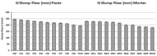 The fresh property (workability) of the produced geopolymer samples (paste and mortar) was measured according to ASTM C1437-20 (standard test method for the flow of hydraulic cement mortar) and shown in Figure 4. The conventional flow test was employed to understand the effect of fly ash blended with alum sludge in different replacement content. From the results, the slump flow of the geopolymer mix decreased when alum sludge was increased in the mix for paste and mortar, respectively. Hence, with increased replacement content with alum sludge up to 60%, the slump flow decreased. In contrast, the results indicated that the replacement of fly ash with alum sludge from 10% to 30% showed a slight decrease in slump flow for both paste and mortar when compared with the control sample (FA0). This is an indication that these replacement content (FA0, FA1, FA3, MA0, MA1, MA2, and MA3) have more viscosity and flowability than other replacement content in the mix. The mix with only fly ash for both geopolymer paste and mortar showed a higher flowability. This could be because alum sludge has more absorbing capacity than fly ash [,]. Thus, when alum sludge replacement content increases in the mix, the absorption capacity increases due to higher dust content in the mix that was not fully consolidated by the alkalis. However, a slight decrease in flowability was observed in the result of geopolymer mortar from the control mix (MA0) to (MA2). The experimental result presented shows that all geopolymers mixed with alum sludge as a substitute to fly ash had no sign of bleeding or segregation during the casting process as all the materials were properly blended and flowable as shown in Figure 3. However, it is noticed in Figure 4 that the alum sludge had a slight variation in the flowability of produced geopolymer materials (paste and mortar) at higher replacement content.