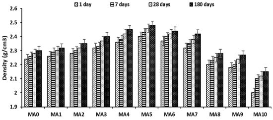 A similar behavior was found in the case of geopolymer mortar from Figure 6, and the results indicate that the density of mortar improved (increased) with an increase in curing age and with replacement content from 10% to 50%. In contrast, an increase in alum sludge content above 50% attracted a reduction in the density of mortar. However, this is to state that the high substitute content of alum sludge reduced the density of both paste and mortar.