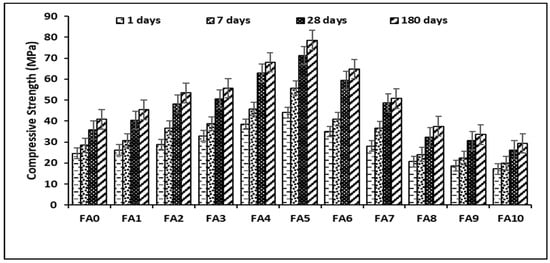 However, the compressive strength behavior of geopolymer paste was somewhat similar to the compressive strength behavior of the geopolymer mortar as presented in Figure 8. For geopolymer mortar, it was observed that the strength also increased with an increase in age of curing for every replacement content, but decreased when replacement content was increased (increase in alum sludge above 50%). For example, the compressive strength of the control sample (MA0) at 1 day of curing was 19.55 MPa, while the geopolymer sample at 50% replacement content of fly ash had a strength increase of 40.6 MPa. The increase in compressive strength of the produced geopolymer mortar might be attributed to the concentration of the alkali solution in the mix [,]. This indicates that proper concentration and blending of alkali solution with suitable molarity is another defining factor in the compressive strength of geopolymer mortar. It has been established in past that 10 to 15 molar ratios yield more improved workability and strength of geopolymer [].