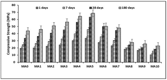 Figure 10 and Figure 11 represent the effect and behavior of alum sludge on the increase in the strength of geopolymer paste and mortar. From the graph presented in Figure 10 (geopolymer paste), it was observed that the rate of strength increase was progressive even after 28 days, which showed a sign of a chemical effect (pozzolanic effect) due to the slow and constant release of increased concentration of silica and aluminum in the internal structure of geopolymer paste. This process yields a firm geopolymerization by forming a stronger bond due to the rich reactive aluminosilicate in both constituent materials (fly ash and alum sludge) that were dissolved in the alkali solution []. This behavior was significant in the sample with alum sludge replacement contents of 40, 50, 60, and 70 (MA4, MA5, MA6, and MA7), respectively. The graphs from both Figure 10 and Figure 11 show a decrease in the compressive strength when the alum sludge content was above optimum. At this stage, the rate of decrease in the compressive strength increased in both replacement content and curing age.