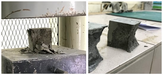 Figure 9 shows the pattern of failure for the geopolymer mortar specimen for MA5 (50% alum sludge replacement) after compressing the sample. It is seen from Figure 9 that the failure crack pattern was developed on the sides of the cube samples without any visible damage on the top and bottom of the cube sample touching the bottom and top plate of the compressive strength machine. Geopolymer mortar samples with alum sludge replacing fly ash and samples with fly ash displayed distributed cracks. No form of an explosive pattern of failure was observed, and all cracks were vertical in appearance with an hourglass shape. This failure pattern was observed in all the geopolymer paste and mortar samples in all curing ages.