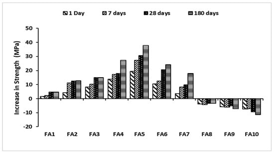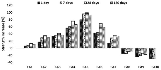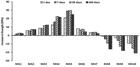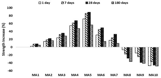 Figure 12 and Figure 13 present the results for the percentage increase in strength for geopolymer paste and mortar. These results were derived by calculating the percentage increase in strength between the control sample (FA0, MA0) and other replacement content in the mix for both geopolymer paste and mortar. From the results, it was observed that the addition of alum sludge to the mix aided the percentage increase for both paste and mortar, respectively, with a significant percentage increase at 28 days. The behavior was observed in both geopolymer paste and mortar at 28 days curing age; for example, geopolymer paste FA1 at 1 day curing age had a percentage increase of 6.7%. However, when the curing age progressed to 7 days, 28 days, and 180 days, the percentage increase became 7.9%, 13.4%, and 11.3%, respectively. This indicates that a significant increase occurred at 28 days of curing age, but the percentage rate of increase decreased when the curing age progressed to 180 days when compared with the percentage increase at 28 days of curing age.