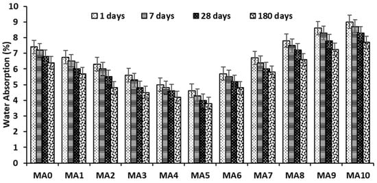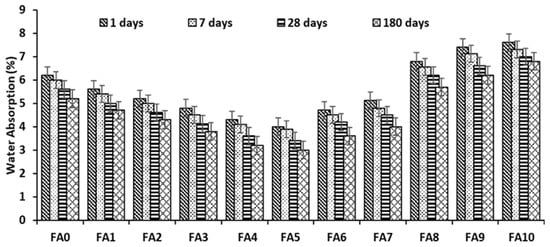 Investigation of water absorption by geopolymer paste and mortar was necessary for the evaluation of the behavior and effect of alum sludge as a substitute to fly ash on the produced paste and mortar. The study of water absorption is very important, especially when a new sample is introduced in the production of any construction material. The test was performed on samples at 1 day, 7 days, 28 days, and 180 days. Figure 14 and Figure 15 present the results for geopolymer paste and mortar with alum sludge partially and fully replacing fly ash in different curing ages. From the results, it was detected that there was a decrease in water absorption when the curing age was increased and this behavior was observed in all replacement contents. A progressive reduction in water absorption with an increase in alum sludge content was also detected. Alum sludge at 50% replacement showed improved resistance to water absorption, compared to the control sample and the other replacement content (FA0 and MA0) for both paste and mortar samples. For instance, geopolymer paste FA0 at a 1 day absorption rate was 6.2% while FA5 at a 1 day absorption rate was 4%, respectively, which is the lowest absorption rate when compared to other samples in this study. However, the decrease in absorption could be related to the addition of alum sludge as a substitute to fly ash which improved the geopolymer structure by reducing the void within the internal structure of the samples. Another factor could be due to the improvement of density and compact structure by alum sludge at optimum replacement content that produced a new formation of aluminosilicate gel which enhanced the filling effect by the materials. This can also be related to the improved compressive strength as reported in Section 3.2 for both geopolymer mortar and paste.