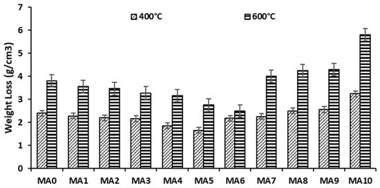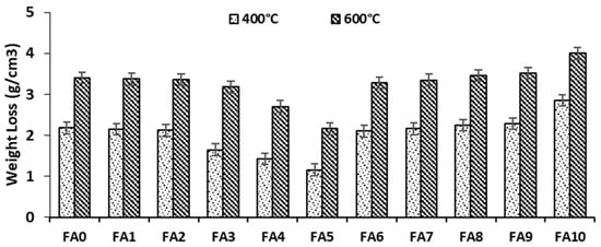 Figure 16 and Figure 17 present the results of weight loss for geopolymer paste and mortar manufactured using alum sludge as a substitute to fly ash. From the presented graph (Figure 16 and Figure 17), it can be seen that the weight loss of both geopolymer paste and mortar increased due to an increase in elevated temperature. Meanwhile, a different behavior was observed when the replacement material (alum sludge) was utilized as a substitute to fly ash for the production of geopolymer paste and mortar. The results indicated that the loss of weight reduced with an increase in alum sludge up to 70% but increased in weight loss at replacement content above 70%. From Figure 14 for instance, FA0 (control sample) had a weight loss of 2.18 g/cm3 when the temperature was elevated to 400 °C but when it was increased to 600 °C, the weight loss increased to 3.4 g/cm3. However, it was seen that alum sludge employed in the mix as a substitute to fly ash for FA, yielded a slight weight reduction (2.15 g/cm3) at a temperature of 400 °C and when the temperature was increased to 600 °C, the weight loss was 3.37 g/cm3. This behavior affirmed that there is an improvement in resistance to loss of weight when alum sludge was utilized in optimum content as a substitute to fly ash for the production of geopolymer paste and mortar. Moreover, when alum sludge was added to the geopolymer mix above optimum (70%), a progressive increase in loss of weight was observed in FA8 when compared with FA0 and FA5. With a weight loss of about 2.25 g/cm3 and 3.46 g/cm3 for the elevated temperature of 400 °C and 600 °C, respectively, while for FA5, weight loss was seen to be 1.16 g/cm3 at 400 °C and 2.16 g/cm3 for temperature elevated up to 600 °C. This behavior by geopolymer paste and mortar using 50% alum sludge as a substitute to fly ash (FA5 and MA5) is an indication that blending alum sludge in an optimum content significantly improved the resistance to loss of weight when subjected to elevated temperature.