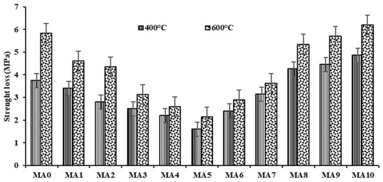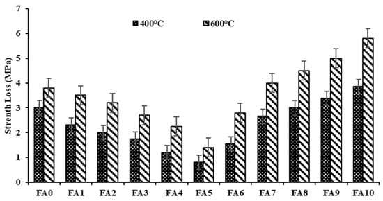 Strength loss due to elevated temperature for geopolymer paste and mortar is presented in Figure 18 and Figure 19. The results from this experiment indicated a decrease in compressive strength when the temperature was increased. This decrease in strength was due to exposure to elevated temperatures of 400 °C and 600 °C. It was observed that loss of strength was less at 400 °C when the loss in compressive strength was compared to the strength loss at 600 °C. However, the behavior of the manufactured geopolymer paste and mortar showed high strength loss at an exposure of temperature up to 600 °C than the samples subjected to a temperature of about 400 °C. This means that a temperature of about 400 °C showed no significant effect on the strength loss of geopolymer paste and mortar. For example, at an elevated temperature of 400 °C, FA0 and MA0 strength losses were 3 MPa and 3.75 Mpa at 400 °C, but at 600 °C the strength loss was 3.8 MPa and 5.83 MPa, respectively. For FA5 and MA5, strength loss was 0.8 MPa and 1.6 MPa, while at 600 °C temperature, strength loss was 1.4 MPa and 2.15 MPa. Additionally, the decrease in resistance to strength loss due to elevated temperature of geopolymer samples with alum sludge as a substitute to fly ash compared with control samples (FA0 and MA0), shows that the resistance to strength loss decreased progressively with an increase in alum sludge content. This performance was found in all geopolymer samples manufactured with alum sludge as substitute material to fly ash for both paste and mortar. Thus, this means that geopolymer paste and mortar with alum sludge as a substitute to fly ash yielded low resistance to relative loss in strength due to elevated temperatures above 400 °C. This was except for geopolymer paste and mortar above 70% replacement content (FA7 and MA7), which was seen to have a progressive increase in loss of strength (lower resistance to compressive strength loss).