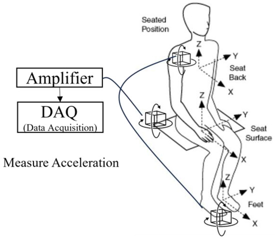 ISO 2631-1:2003 defines a method for quantitatively evaluating the health, comfort, perception, and motion sickness phenomena of the human body when exposed to whole-body vibration [12]. The direction of the human body when exposed to vibration, such as a seated, standing, or lying down position, is evaluated using frequency-weighted acceleration response, which is calculated by applying different vibration weighting filters and evaluated by various evaluation indices, such as the RMS (root mean square), MTVV (maximum transient vibration value), or VDV (vibration dose value), depending on the form of the acceleration response.