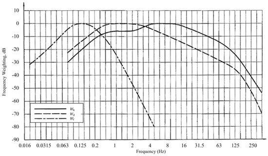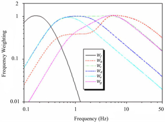 BS 6841:1987 provides a standardized method for measuring and evaluating vibration and repetitive shocks [11]. The evaluation method considers frequency weighting functions, root mean square acceleration (RMS), vibration dose value (VDV), and discomfort symptoms in the low-frequency range of 0.1–0.5 Hz. BS 6841 defines frequency weighting functions for each of the 12 axes, thus providing specific distinctions for applying filters to each vibration axis. Compared to ISO 2631-1, BS 6841 is a highly preferred evaluation standard in the general industry. The reason for applying filters is to correct the perception of the strength of acceleration coming from the same vibration source, which varies in different directions, as shown in Figure 1. The weighting values related to the filter are shown in Table 2. The frequency weighting function graph drawn according to this table is shown in Figure 2.