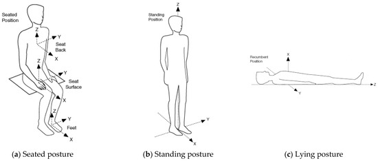 ISO 2631-1 considers the frequency-weighted acceleration response based on the sensitivity of the human body. To account for this, the level of perceivable acceleration response changes depending on the direction in which it is transmitted to the human body. Therefore, the human vibration is evaluated using the human coordinate system presented in Figure 3, where the z-axis is in the direction of the spine.
