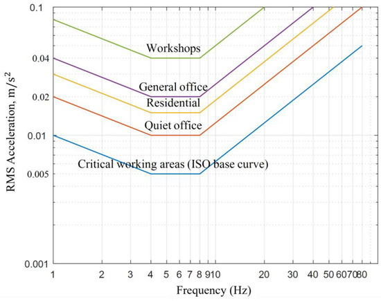 ISO 10137:2007 regulates the method of quantitatively evaluating the serviceability of structures such as buildings or bridges for users exposed to vibrations [17]. Based on the evaluation indices and weighting of vibration numbers in ISO 2631-2:1989, the standard evaluates human vibrations through quantified results [18]. ISO 10137 determines the standard curves for human vibrations and presents these according to the purpose of the building, based on the RMS acceleration. Figure 5 is the evaluation curve of vibration serviceability presented in ISO 10137.