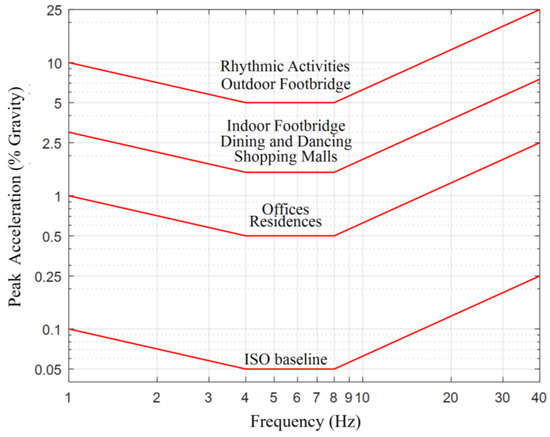 To verify these results, in 1973, Hansen, Reed, and Vanmarche conducted a survey of workers in a 40-story steel-framed building and measured the acceleration values that caused discomfort [10]. Based on the above studies, serviceability criteria for predicting the dangers of whole-body vibration to human health were established that can be applied to various situations such as building vibrations, machinery vibrations, and train interior vibrations. However, when applying these criteria to buildings, they only apply to buildings with frequencies above 1 Hz and below 1 Hz.