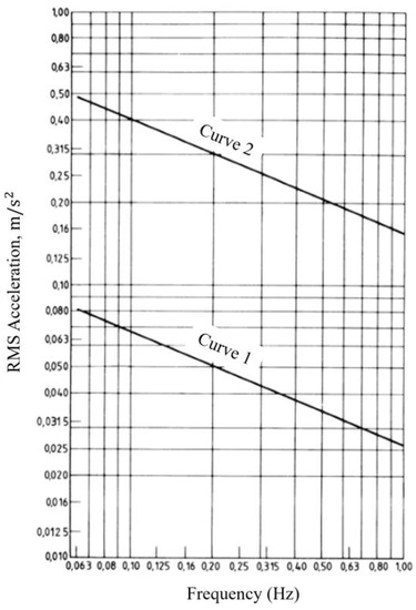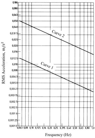 ISO 6897:1984 was established due to the increase in building modifications caused by industrialization as well as the increase in the number of high-rise buildings, in order to verify the impact of low-frequency horizontal movements on residents [19]. It also acts as a guide for designing structures so as not to harm the health of people living in fixed structures that are frequently exposed to storms, such as marine structures. This standard is evaluated with the RMS value of acceleration for the 5-year expected wind speed of the 10 min average wind speed and suggests curves that can be applied to the evaluation of the four rarely occurring vibrations. Figure 7 shows the curve that can minimize the negative response of people to horizontal vibration in buildings and marine structures that are commonly used. Figure 8 shows the average value and lower threshold value of recognition for horizontal vibration.