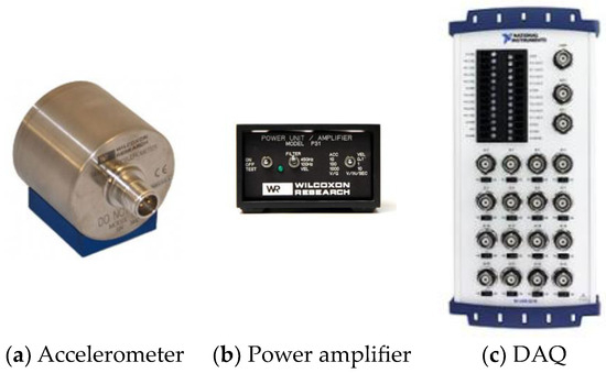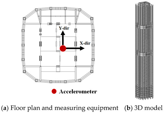 The target building for measurement is a 63-story reinforced concrete structure located in Nam-gu, Busan, featuring a basement with four levels. The lateral resistance system comprises an internal core and external mega columns. The belt wall system, which resists horizontal forces, is supported by eight outrigger trusses located on the 28th and 29th floors as well as the 48th and 49th floors. The building stands at 289 m tall, and the seismic coefficient used in its structural design is 6.3, which represents an earthquake with a magnitude that occurs once every 1000 years. The building was completed in 2013. The area from the ground floor to the 3rd floor is used for sales facilities, and that from the 4th floor to the 62nd floor is designated for office purposes. The basement, which comprises the 1st to the 3rd floor, is used for parking and machinery rooms, and the top floor, the 63rd floor, is used as an observation deck. Accelerometers were installed in the central roof of the 63rd floor in the x- and y-directions, and the location of the accelerometer is shown in Figure 9. The accelerometer and the data collection device used for measurement are shown in Figure 10 and Table 7. The accelerometer is a high-sensitivity accelerometer capable of low-frequency vibration measurement, and the data collection device is a commercially available device with a ± 10 V measurement range and 16-bit resolution. The sensitivity of the accelerometer during acceleration measurement was set to 100 V/g.
