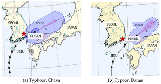 The data were measured with a 1000 Hz sampling rate and stored in 10 min intervals. Table 8 shows the data collection time and weather conditions, and Figure 11 shows the actual path of the typhoon. The ambient vibration conditions during the measurement were measured with an average wind speed of 0.1 m/s, in a warm and calm condition just after the passage of Typhoon Chaba in 2016. The vibration records of the typhoon’s passage were collected at the time when the maximum wind speed was recorded at its highest. In the case of Typhoon Danas in 2013, the typhoon’s passage and average wind speed were similar, but the maximum wind speed was higher, at 22 m/s, compared to 14 m/s for Typhoon Danas. Additionally, the wind speed and direction information during the monitoring period were obtained from a weather station located 6 km away from the target building and measured on a minute-by-minute basis.
