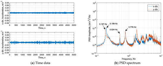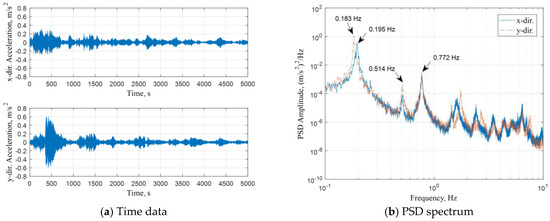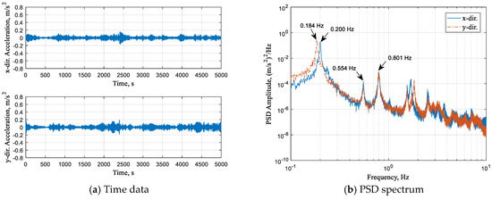 Figure 12, Figure 13 and Figure 14 show graphs of the x- and y-direction’s highest floor vibration acceleration waveform and PSD spectrum for three wind loads. The vibration acceleration time history represents the signal that passed through the low-pass filter with a center frequency of 10 Hz, and the PSD spectrum was analyzed using a Hanning window with a resolution of 1000 Hz. The size of the steady-state unvibrated acceleration waveform in Figure 12a is 1/10 the scale of the typhoon vibration acceleration waveform in Figure 13 and Figure 14, indicating that the steady-state unvibrated acceleration is very small. The effective acceleration in the x-direction over a 5000 s interval is 0.0016, and in the y-direction, it is 0.0022 m / s 2 , respectively. When the same analysis conditions are applied, the effective acceleration under the condition of Typhoon Chaba in Figure 13a is 0.0508 and 0.0707 m / s 2 , and the effective acceleration under the condition of Typhoon Danas in Figure 14a is 0.0311 and 0.0429 m / s 2 . In the initial 500 s of the Typhoon Chaba condition in Figure 13, the maximum wind speed was 22 m/s, and the maximum acceleration occurred in the y-direction, reaching 0.609 m / s 2 .