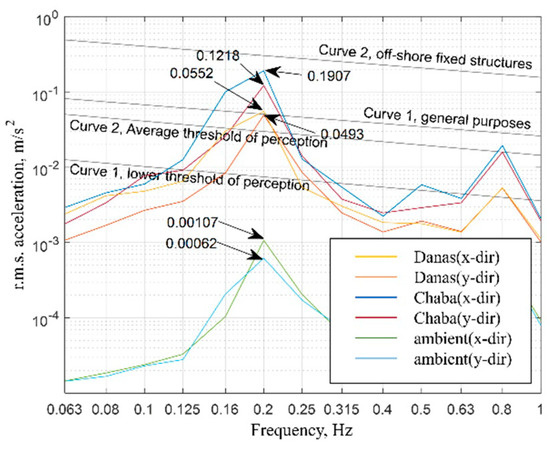 Figure 16 is a spectrum that shows the effective horizontal vibration acceleration at a one-third octave center frequency, based on the ISO 6897 standard. The frequency at which the maximum value of the average actual acceleration over 10 min measured for 2 h was located is close to the 0.2 Hz center frequency, which is close to the building’s first-mode natural frequency in all conditions. The actual horizontal vibration acceleration value at the upper floor of the building was below the lowest level that can be perceived by people under the condition of continuous non-vibration. However, under the two typhoon conditions, the actual horizontal vibration acceleration value exceeded the average threshold that adults can perceive on average and was evaluated as exceeding the size of the allowed acceleration (0.05 m/s2 at 0.2 Hz) for a general-purpose building (curve 1, general purpose).