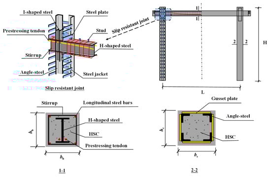 With the advancement of building engineering to super high-rise, massive loads, and wide spans [], building structures not only pursue higher stories but also require a larger span, so conventional reinforced concrete (RC) structures and steel-reinforced concrete (SRC) structures have faced great challenges, because they cannot meet functional needs well. It is well-known that the application of prestressing technology to the frame system can make the structure realize a larger span [], but it will also lead to many problems in the conventional frame system. If solid-web SRC composite columns [] or concrete-filled steel tube (CFST) columns [,] are used in the frame structures, the prestressing tendons organized in the frame beams definitely pass through the steel or steel tubes in the columns, which greatly weakens the stiffness of the joints for the frames. It is challenging to achieve tensioning and anchoring of the prestressing tendons at the ends of the columns without altering the stiffness of the steel for the joint zone. In order to handle the problem of tensioning and anchoring for prestressing tendons reasonably, a kind of novel frame system consisting of hollow-web angle steel high-strength concrete columns and H-shaped steel high-strength concrete composite beams prestressed with bonding tendons is proposed, as shown in Figure 1 []. The angle steels are set as far as possible in the four corners of the columns, replacing the traditional longitudinal steel bars, and the angle steels are welded with steel plate hoops together, forming a spatial steel skeleton and confined concrete to bear the external load of the component. The H-shaped steel sections and prestressing tendons in the frame beams can pass through the gap of the angle steels for frame columns, which can solve the problem of tensioning and anchoring the prestressing tendons well. On the top and lower flanges of the H-shaped steel section in the joint area, a specific length of I-shaped steel is welded. Thus, a strong anti-slip joint can be formed, as shown in Figure 1. This kind of frame system is suitable for the new construction and story-adding reconstruction of existing buildings [].