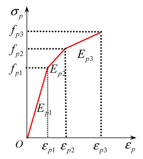 where Ep1 is the elastic rigidity of the proportional stage, Ep2 is the elastic rigidity of the unproportional stage, and Ep3 is the post-yield stiffness; fp1 and εp1 are the stress and strain of the limit point of prestressing tendons corresponding to the proportional stage; fp2 and εp2 are the stress and strain at the yield point of prestressing tendons; and fp3 and εp3 are the stress and strain at the limit point of prestressing tendons.