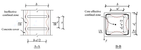The constitutive model (CM) of confined concrete was successfully presented by Pagoulatou et al. [], Teng et al. [], Mander et al. [], and Han et al. [], and the CM of unconfined concrete has been presented in the code for design of concrete structures (GB50010-2010) in China []. A comparison between them is shown in Figure 3. Considering the constraint effect of stirrups in frame beams on concrete, the CM proposed by Mander et al. [] is adopted for the stress–strain relationship of concrete in the stirrup confined zone under axial compression. Since steel plate constraint is slightly different from stirrup constraint, the calculation of effective constraint stress in Mander model is modified, as shown in Equations (2)–(9), and the effective confined zone of the concrete column with steel plates is shown in Figure 4. The two-parameter model given in the code for design of concrete structures (GB50010-2010) [] is adopted for the stress–strain relationship of core-constrained concrete under axial tension and CM of ordinary concrete, as shown in Equations (10) and (11). The plastic damage model of concrete [,,] was implemented to simulate modeling of cracks and the specific concrete plastic damage definition can be found in Table 3.