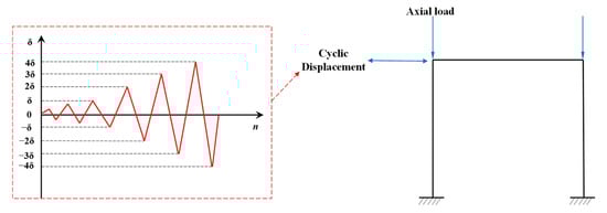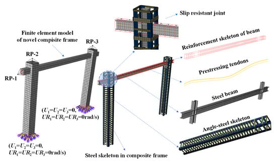 Figure 5 illustrates how the FE models of PSRCFs were created using ABAQUS6.14 software. Concrete was established by adopting element C3D20R, H-shaped steels, and angle steels were established by element S4R, and the stirrups and prestressing tendons were established by element T3D2. During the process of FE modeling, the angle steel skeleton, H-shaped steels, and prestressing tendons were embedded in the entire model. The three reference points (RP-1, RP-2, and RP-3) were established from one side of the beam ends and two tops of the columns. The bottoms of the columns were completely fixed, and the displacements in the X, Y, and Z directions (U1 = U2 = U3 = 0) and the rotations about three directions (UR1 = UR2 = UR3 = 0) were restricted. The elastic compression of concrete, the stress relaxation of prestressing tendons, the deformation and slip of anchor fixtures for tension, and the friction between the prestressing tendons and surrounding contact would lead to the loss of prestress. Hence, for static analysis, prestressing effect was applied through the cooling method first, and then the vertical load and horizontal load were applied according to the loading rules. During the quasi-static analysis, the first two analysis steps were the same as the static analysis, but in the third step, horizontal cyclic load was applied according to cyclic loading rules, and the loading system is shown in Figure 6.