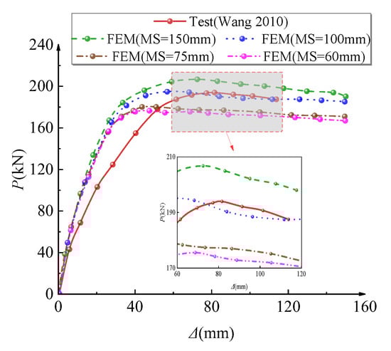 The quasi-static test on a steel-reinforced concrete frame (SRCF) and a PSRCF was carried out by our research group []. The precise specifications of the two test specimens are shown in Table 4. By using the above-mentioned modeling technique, introducing the modified Mander constitutive model and prestressing effects and considering the double nonlinearities simultaneously, the finite element analysis on PSRCFs was carried out. The monotonic load–displacement curves of PSRCF specimens for various mesh size divisions were obtained, as shown in Figure 7. By comparing with the skeleton curves obtained by the experimental hysteretic curves, it can be seen that the mesh size of 100 mm is reasonable. According to Figure 8, the finite element analysis on the two specimens is performed with a constant mesh size. The load–displacement curves produced by numerical simulations are in good agreement with the test findings, as can be seen in Figure 8. Figure 9 and Figure 10 show that there are good agreements between simulation results and experimental results for the overall trends of the skeleton curves and hysteretic curves, indicating that the finite element modeling method proposed in this paper is reasonable.