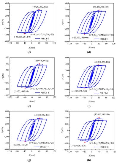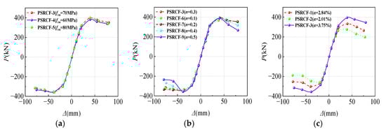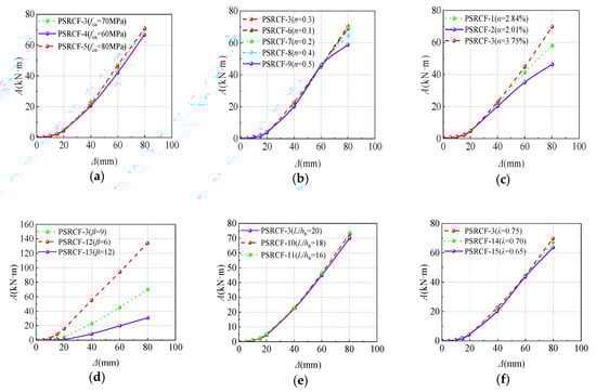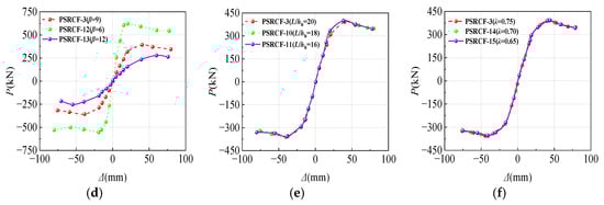 Figure 13 illustrates the load–displacement (P–Δ) skeleton curves of 15 groups of PSRCF specimens, all of which conform to the rule of three broken lines. The ultimate bearing capacity shows a tendency to increase and then decrease as n increases. After the skeleton curve reaches the peak load, the descending section becomes more and more obvious. From Figure 13b, the P–Δ effect is significantly enhanced when n reaches 0.4, indicating that the ductility is reduced, as shown in Figure 13b. From Figure 13c, the initial stiffness of the specimen gradually increases as α increases, and the peak load increases significantly, while the falling section of the skeleton curve tends to be flattened, which is showing excellent load-holding capacity. It can be seen from Figure 13d that with the increasing β, the initial stiffness of the specimen gradually decreases, the peak load greatly decreases, and the skeleton curve declines slowly. Figure 13a,e,f show that the influences of fcu, L/hb, and λ on the peak loads of the skeletal curves for PSRCFs are not obvious.
