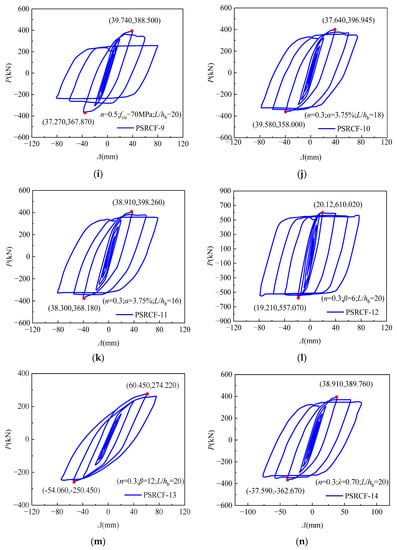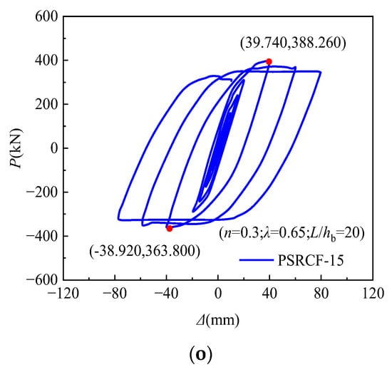 Load–displacement hysteretic curves of 15 PSRCFs specimens: (a) PSRCF-1; (b) PSRCF-2; (c) PSRCF-3; (d) PSRCF-4; (e) PSRCF-5; (f) PSRCF-6; (g) PSRCF-7; (h) PSRCF-8; (i) PSRCF-9; (j) PSRCF-10; (k) PSRCF-11; (l) PSRCF-12; (m) PSRCF-13; (n) PSRCF-14; (o) PSRCF-15.