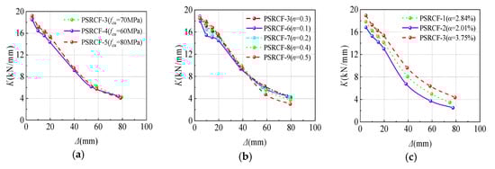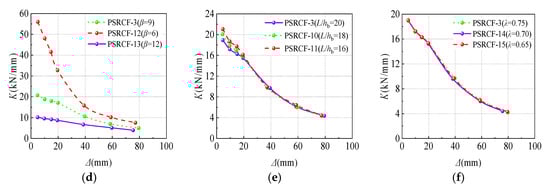 The comparisons on the secant stiffnesses of 15 PSRCFs with different parameters are shown in Figure 14. Ki decreases with the increasing horizontal displacement (Δ), and its decreasing range gradually slows down with the increasing Δ. It can be seen from Figure 14 that with the increasing fcu and n, the initial stiffness and the declining degree of the secant stiffness increase gradually. When n reaches 0.4, the deformation resistance decreases seriously, which indicates that n should not exceed 0.4. The parameters of α and β have significant effects on the secant stiffness of specimens. The parameters α and β show more pronounced effects on the secant stiffness of specimens. The initial stiffness and deformation resistance of the specimen gradually increase with α, and the stiffness degradation phenomenon slows down. With the increasing β, the initial stiffness is significantly reduced, and the stiffness degradation phenomenon slows down. The initial stiffness decreases with the increasing L/hb, while the effects of λ on the stiffness degradations of the specimens are not obvious.