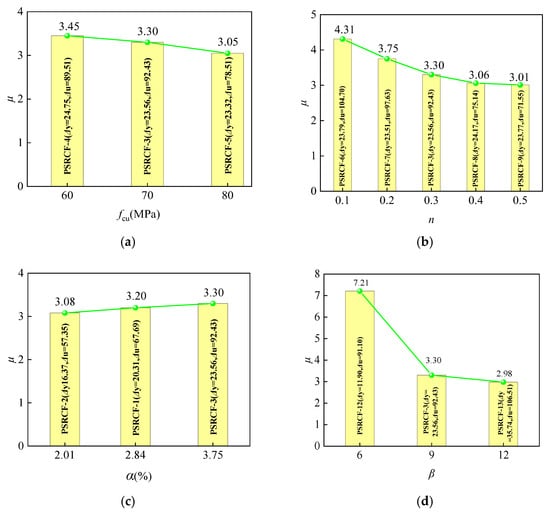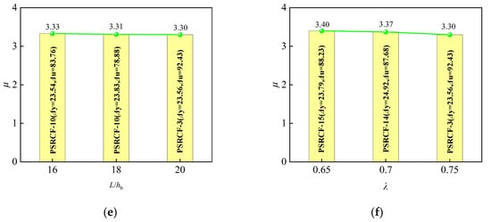 The relationships of μ with different parameters for PSRCF specimens: (a) fcu; (b) n; (c) α; (d) β; (e) L/hb; (f) λ.