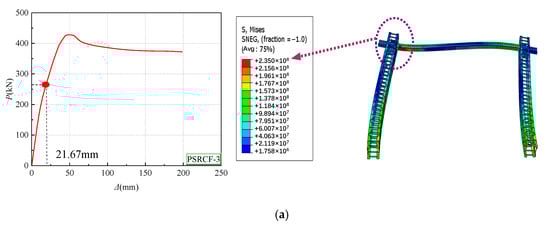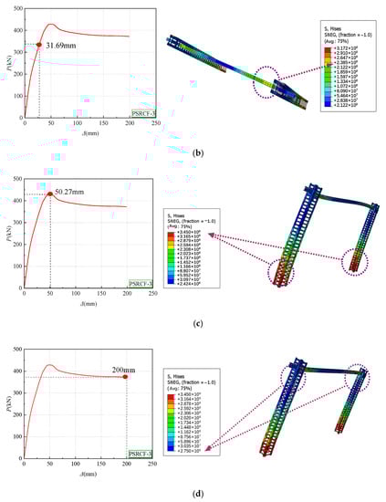 In the post-processing step, the stress contours of the steel skeleton are extracted in Figure 18 at different loading points on the load–displacement curves of the plastic hinge, with PSRCF-3 as an example. When the displacement reaches 21.76 mm, one end of the H-shaped steel in the beam yields, and it is determined that the first plastic hinge of the structure occurs at this position. When the displacement reaches 31.69 mm, the tensile side of the other end of the H-shaped steel in the beam yields, and it is determined that the structure has a second plastic hinge at this position. When the displacement reaches 50.27 mm, the tensile sides of the angle steel sections at the bottoms of the two columns almost reach the yield strength at the same time, and it is determined that the third and fourth plastic hinges appear at the bottoms of the two columns. In the process of subsequent displacement loading, the stress of angle steel at the top of column is small and has not yet yielded, and only the above four plastic hinges are generated. In addition, we can also know that when the horizontal bearing capacity of the structure reaches the maximum, that is when the plastic hinge is generated at the bottom of the column, under the control of the selected parameters, the plastic hinge sequences of all PSRCF models are consistent. The first and second plastic hinges appear at both ends of the beam, and the remaining two plastic hinges are generated at the bottom of the two columns. At this time, the horizontal bearing capacity of the structure reaches its peak. It is determined that this kind of frame has a good mechanism of strong columns and weak beams.