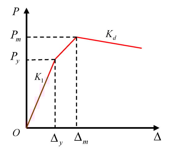 The trilinear skeleton curve model for PSRCFs is produced by statistical regression in accordance with the skeleton curve characteristics, as illustrated in Figure 19. The descriptive formula for the trilinear skeleton curve model is shown in Equation (14).