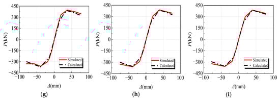 Comparisons between the simulated and calculated skeleton curves of the PSRCS specimens: (a) PSRCF-1; (b) PSRCF-3; (c) PSRCF-4; (d) PSRCF-5; (e) PSRCF-8; (f) PSRCF-9; (g) PSRCF-11; (h) PSRCF-14; (i) PSRCF-15.