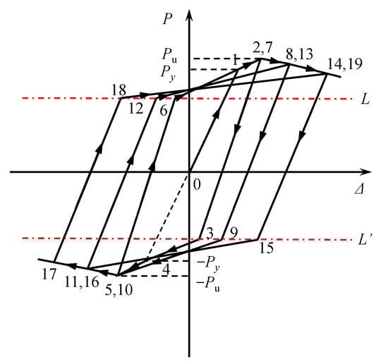 - The loading–unloading rules during the descending segment stageWhen the restitution force surpasses Pu in either the forward or backward direction, the loading stiffness Kd in the descending segment stage of the skeleton curve is employed, while the unloading stiffness is still computed according to Equation (24);